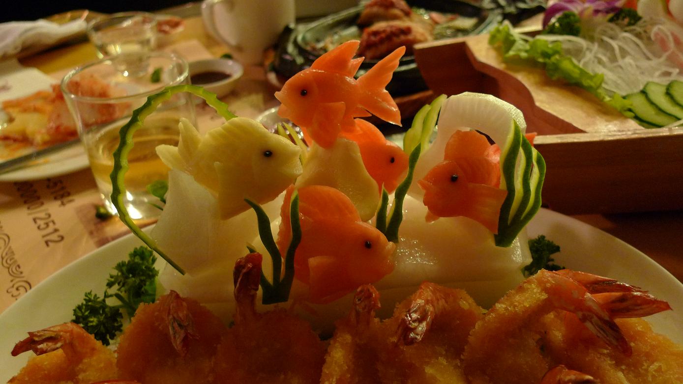 빨간 금붕어는 빨강색 무우, 노란 금붕어는 고구마, 해초는 오이로 조각한...