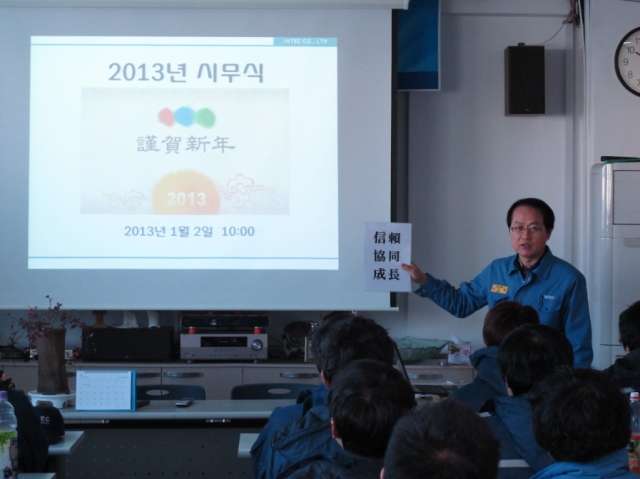본 시무식에서 김인술 사장님은 2013년 사훈으로 '信賴‧協同‧成長'을 선정하고, 신뢰를 바탕으로 신사업을 통해 성장하는 인텍이 되기를 당부하였습니다.