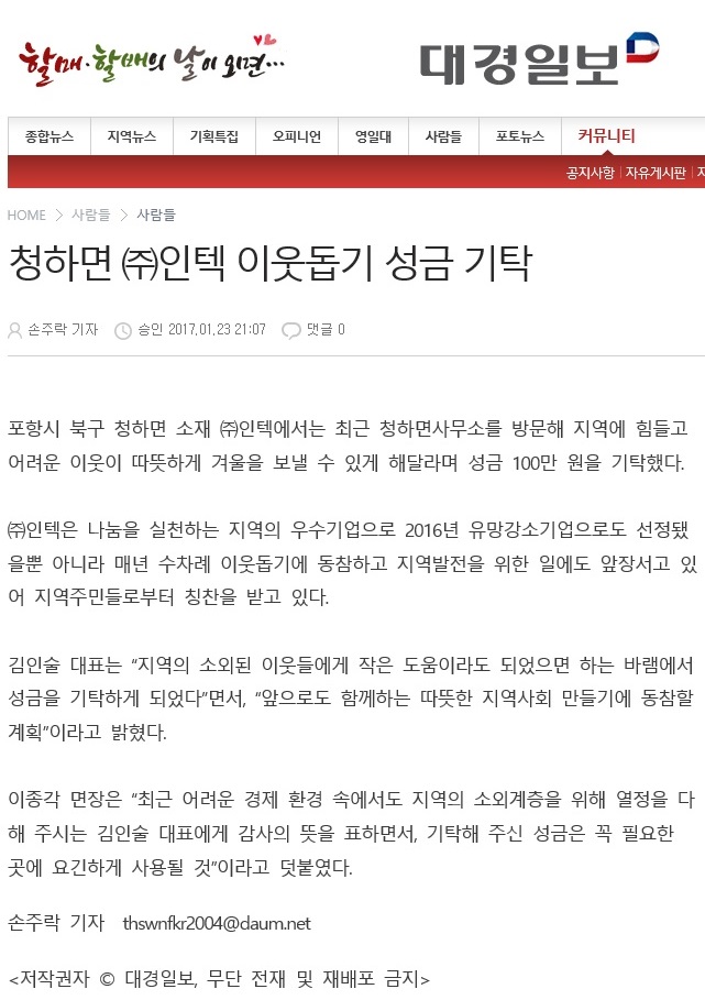 지역 나눔 실천 우수기업 (주)인텍-경상매일신문