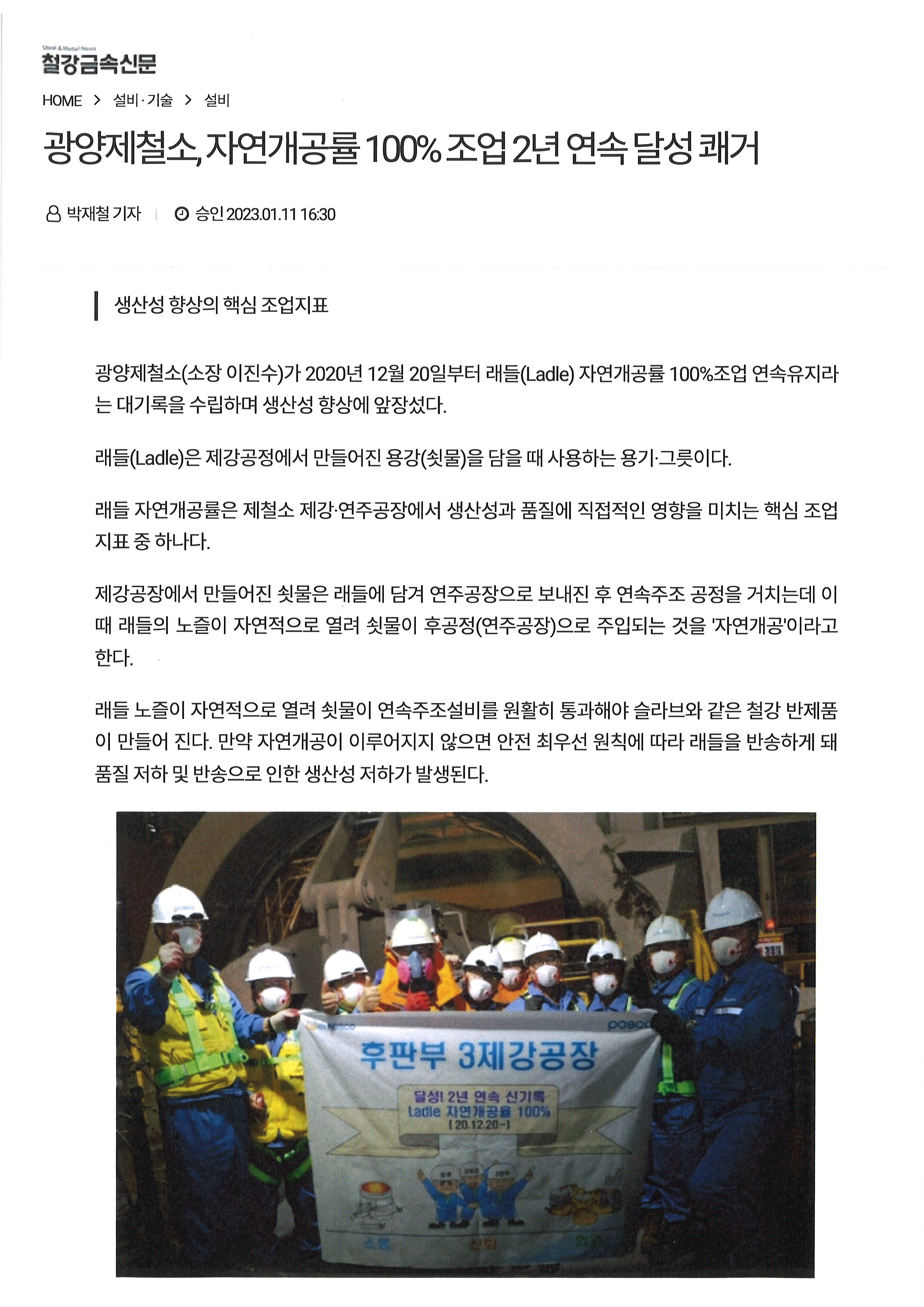 광양제철소 자연개공율 100% 조업2년 연속 달성 축하합니다.