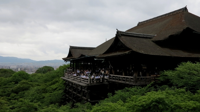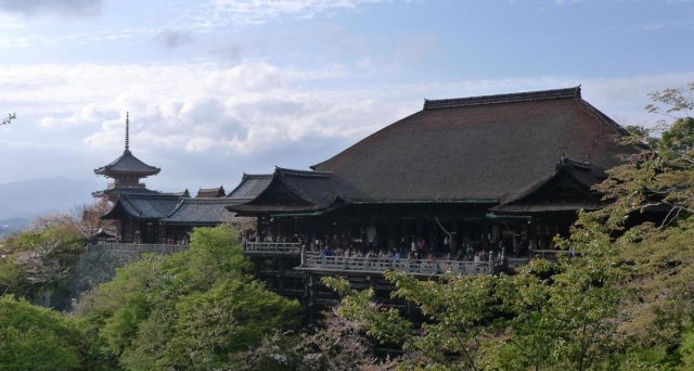 국보인 본당(本堂)의 마루는 139개의 거대한 나무 기둥이 받치고 있으며 교토 시내를 한눈에 내려다볼 수 있으며,