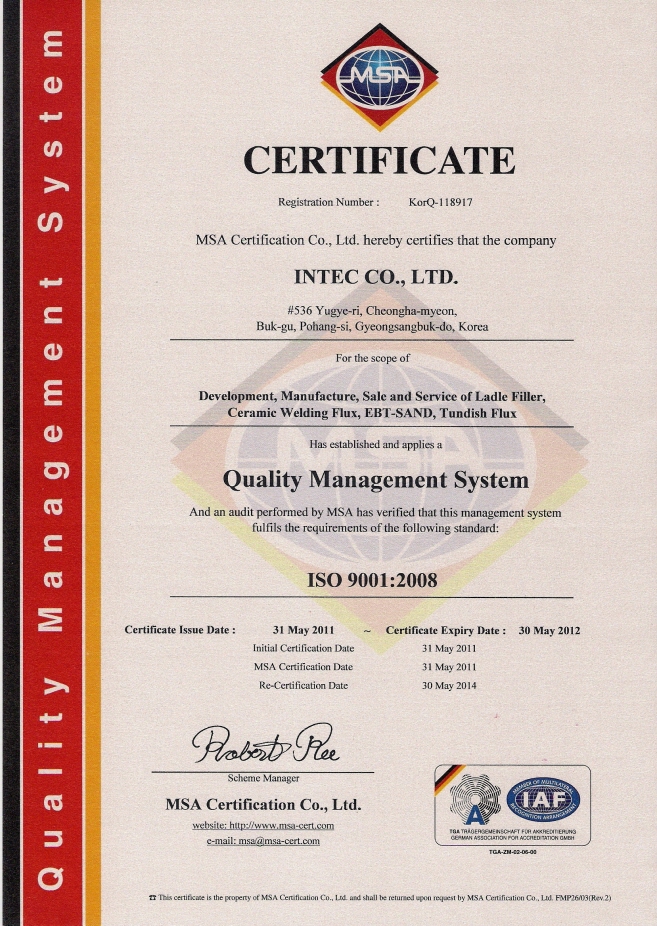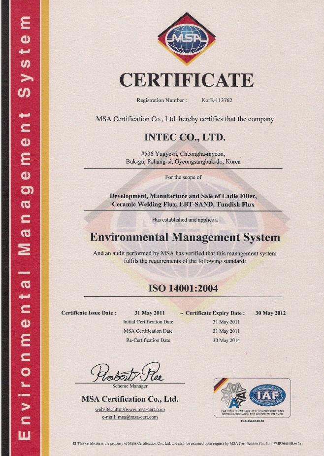 當社는 2011年 5月 31日, ISO 9001:2008(品質經營 SYSTEM), ISO 14001:2004(環境經營 SYSTEM) 認證을 獲得하였습니다.