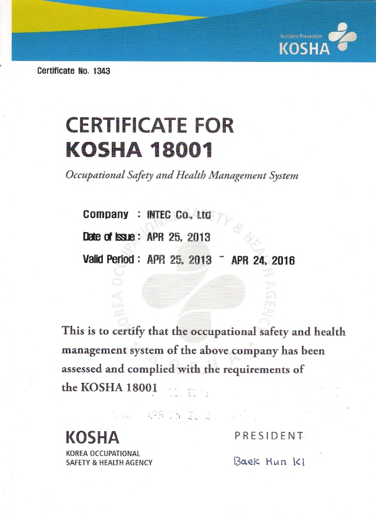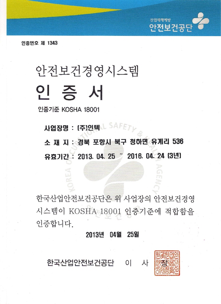 當社는 2013年 4月 25日, KOSHA 18001(安全保健經營 SYSTEM) 認證을 獲得하였습니다.