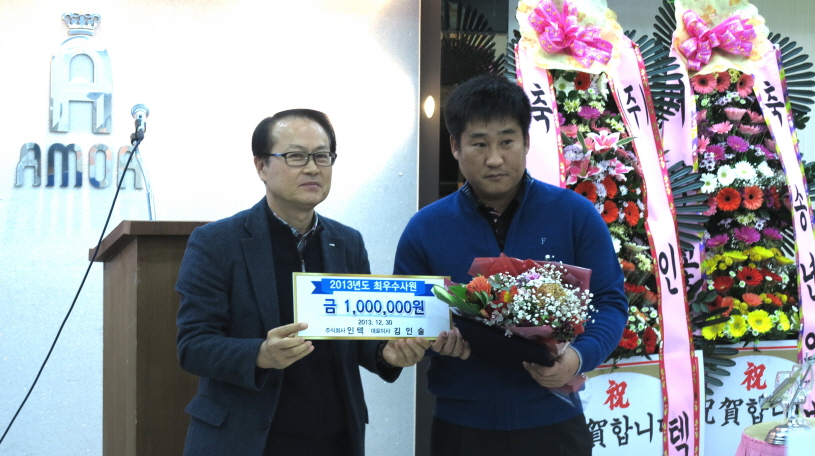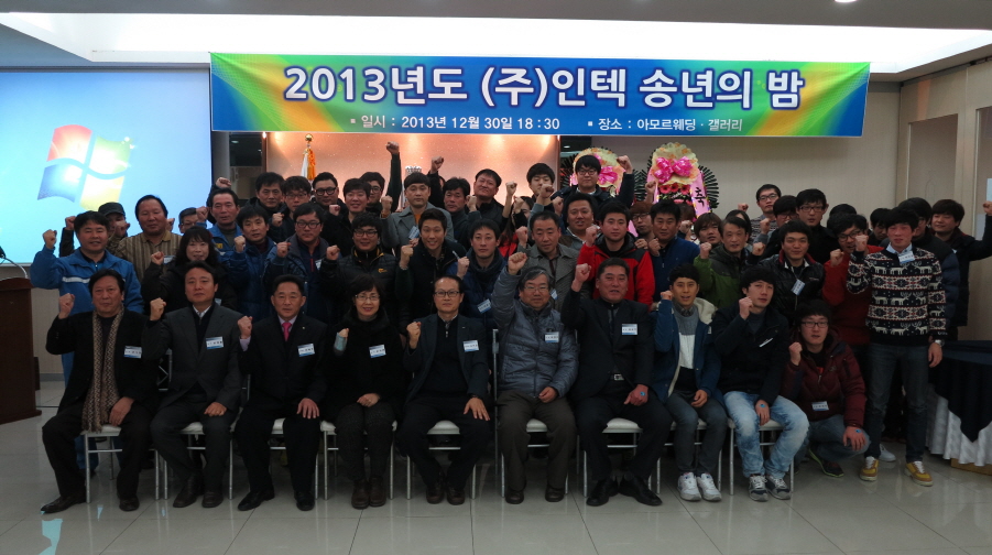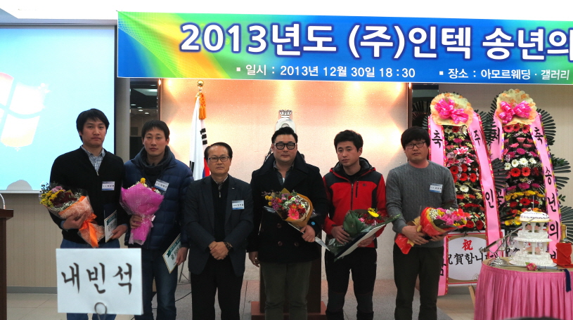 70여명의 직원 및 가족이 참석한 종무식에서 10년 이상 장기근속으로 기술본부 정홍탁 차장이 표창과 함께 부상으로 '부부동반 해외여행 상품권'을 수여받았습니다. 우수사원부문의 최우수상은 공무팀의 김정훈 과장이 안전하고 효율적인 설비 관리 및 개선에 기여한 공로로 표창을 받았습니다. 우수상은 서범수 과장, 최문현 대리, 김일중 주임, 최정민 사원, 김용희 사원이 수상하였습니다. 종무식에서 김인술 사장님께서는 신사업의 개발 및 성장을 위하여 모두가 바쁘게 달려온 한 해를 잘 마무리하고 다가오는 새해에는 한 단계 더욱 도약하여 성장하는 인텍을 만들어 가자고 다짐하고 건강과 안전을 기원하였습니다.