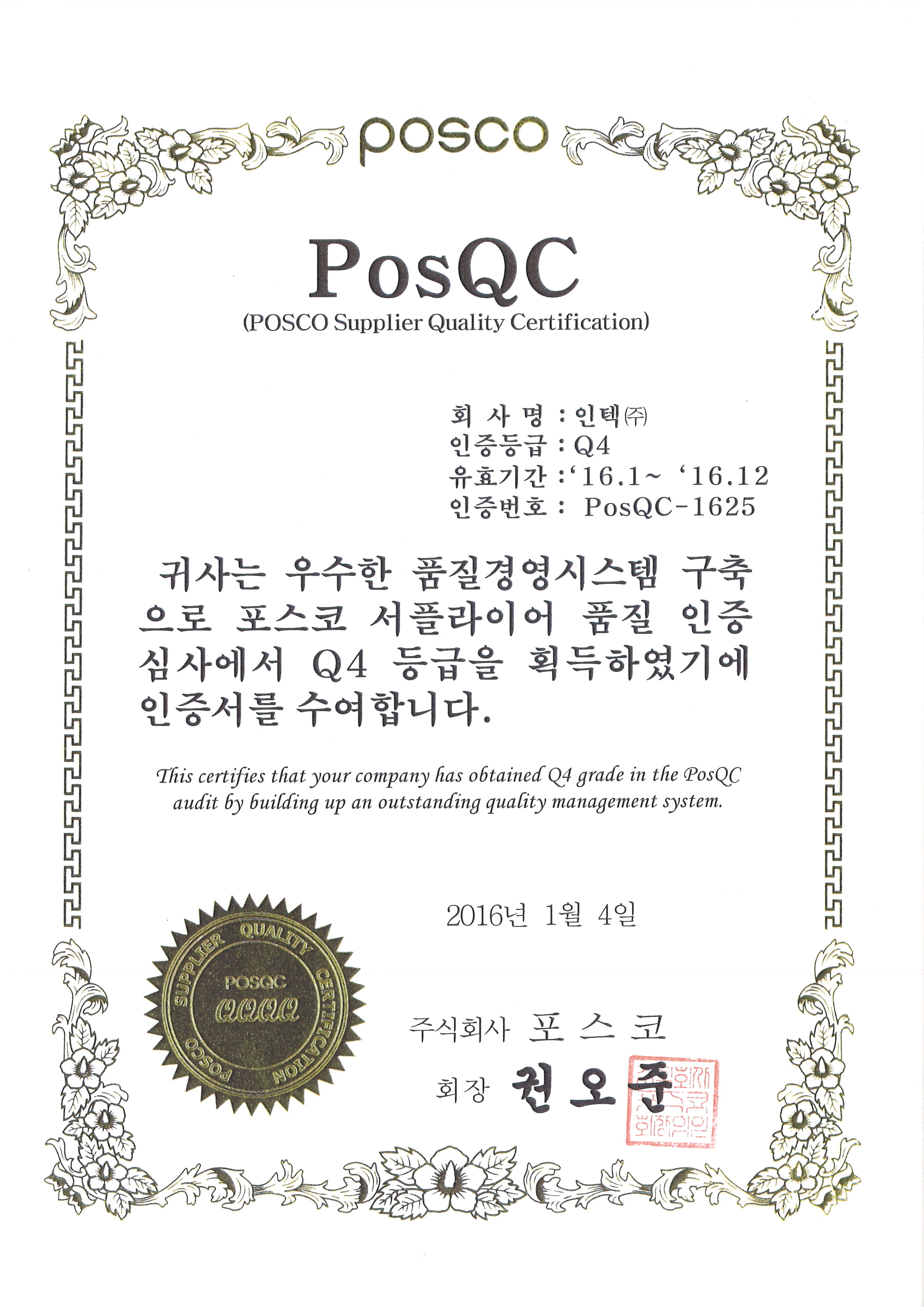 당사는 아래와 같이 2015년 POSCO 품질인증심사에서 Q4등급을 획득하였습니다.