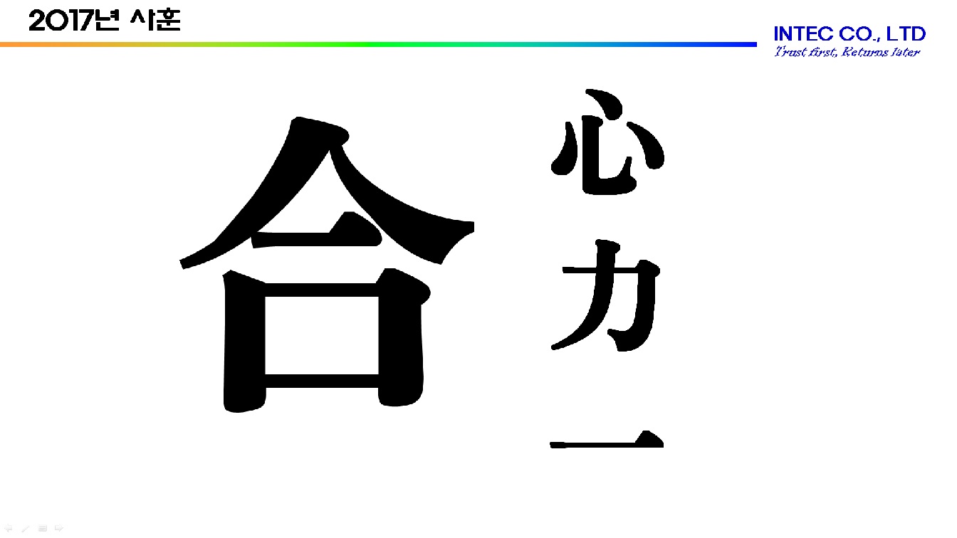 2017년 새해를 맞이하여 合 (合心 合力 合一)의 사훈으로 본사 발전을위하여 일치단결하여 마음을 새로이 가졌습니다.