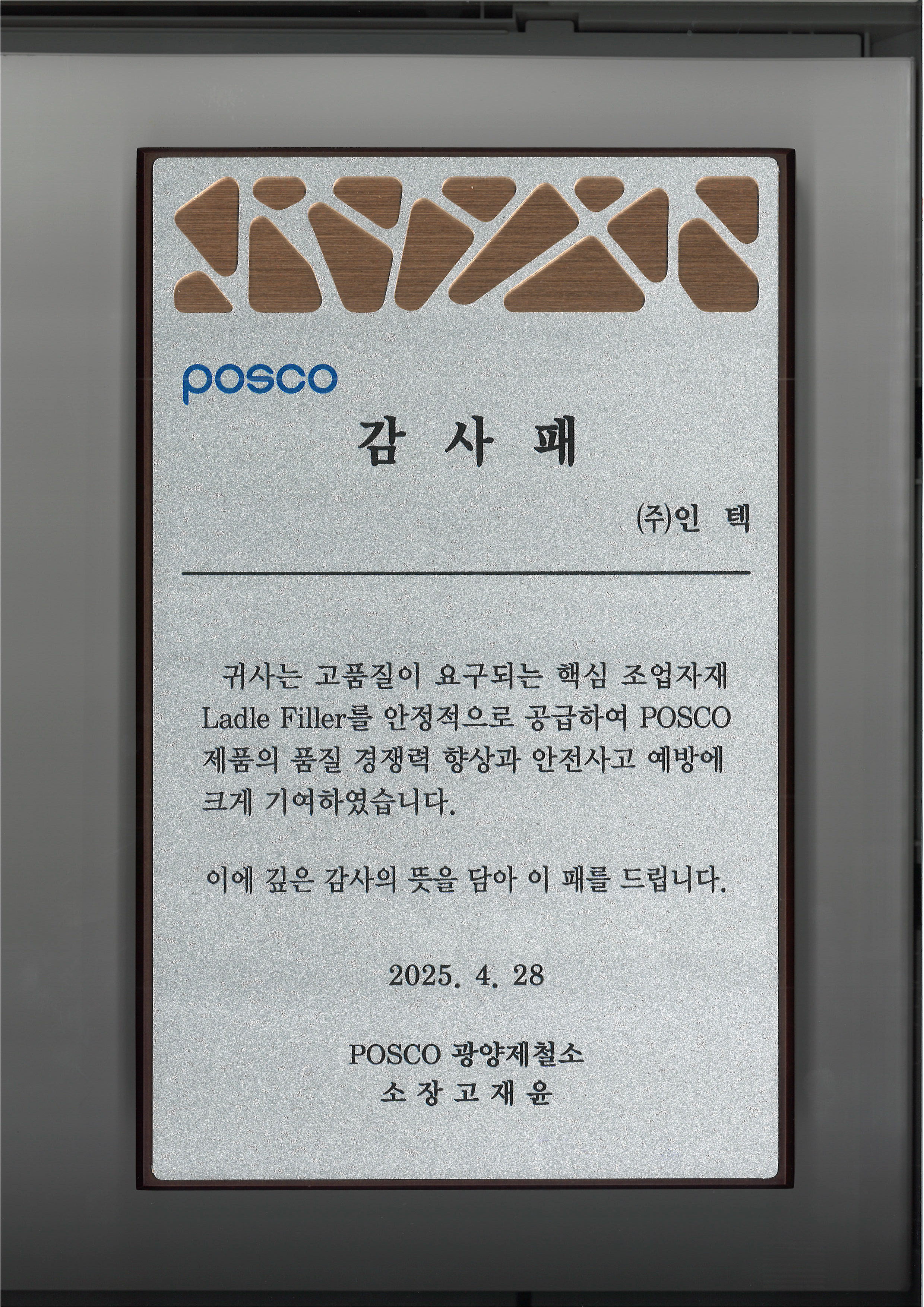 (주)인텍 임직원의 노력으로 POSCO로 부터 감사패 수상하였습니다.